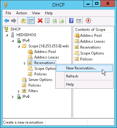 Create a DHCP reservation for each diskless computer that you want to install directly to an iSCSI target. Go to StartAdministrative ToolsDHCP and open up your DHCP scope. Right-click on Reservations and choose New Reservation: