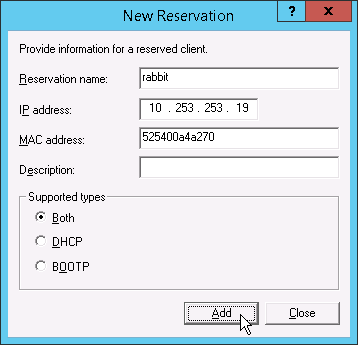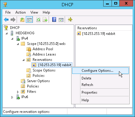 Click on Add to create the reservation, and then Close to close the dialog box. Right-click on the new reservation and choose Configure Options: