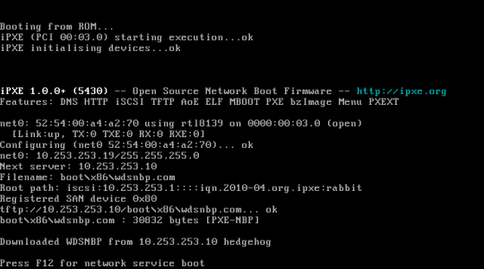 You should see the diskless computer connect to the iSCSI target and then prompt you to “Press F12 for network service boot”: