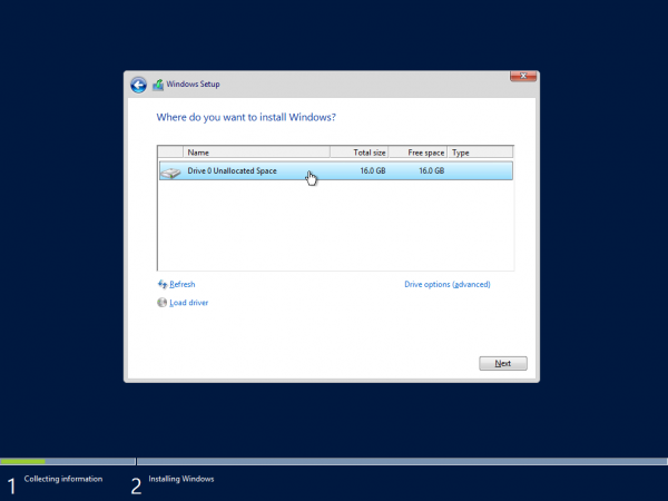 Press F12 to boot from the network, and proceed to install Windows as usual. When you reach the “Where do you want to install Windows?” screen, you should see the iSCSI disk appear as a possible install location: