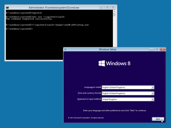 You can now connect to a Windows (or Samba) file server to run the Windows installer. For example, if you have copied the contents of your Windows installation DVD-ROM to \\myserver\installers\win8, then you can start the installer using: