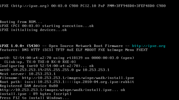 You should see the diskless computer connect to the iSCSI target and then prompt you to ”Press F12 to install Windows”: